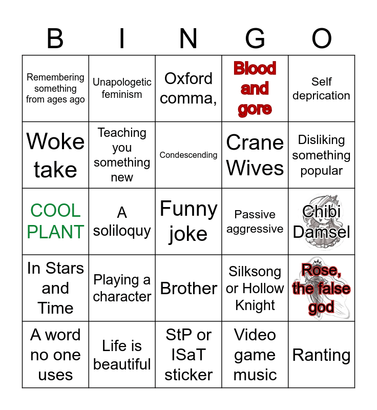 This bingo card has 3 images, a free space and 54 words: Slay the Princess, In Stars and Time, Shiny Pokémon, A new indie game, Brother, Flowery language, Blood and gore, A death threat, Woke take, Something unexpected, Remembering something from ages ago, Existential dread, Life is beautiful, A word no one uses, School story, StP or ISaT sticker, Ranting, Crane Wives, Confused Siffrin, Chibi Damsel, Silksong or Hollow Knight, Biting sarcasm, Passive aggressive, Self deprication, Slaying, Unapologetic feminism, Making fun of the straights, Religion, AI, Video game music, Bad YouTube recommendations, Yew, Recommending a niche YouTuber, Implying they're not human, Oxford comma,, Game grumps, COOL PLANT, Rose, the false god, "I don't want to spoil it", Teaching you something new, The word "Art", Not understanding modern internet culture, A saying no one has ever said before, Genuine advice, Playing a character, D&D, Mythology, Hating modern slang, Condescending, A soliloquy, Disliking something popular, 1 to 3AM, Sudden anti-capitalist agenda and Harsh truth.