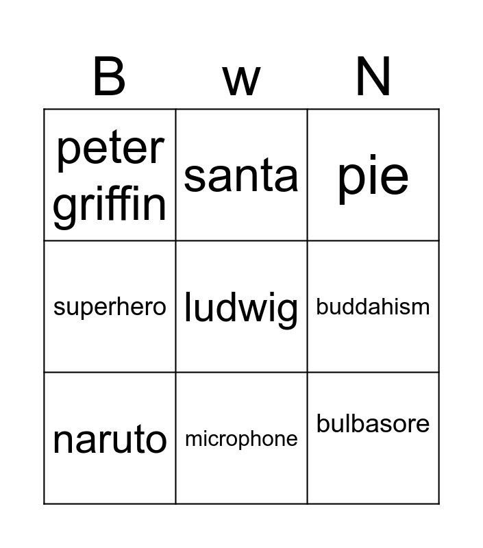 This bingo card has a free space and 9 words: naruto, pie, santa, superhero, peter griffin, buddahism, bulbasore, Albania and microphone.