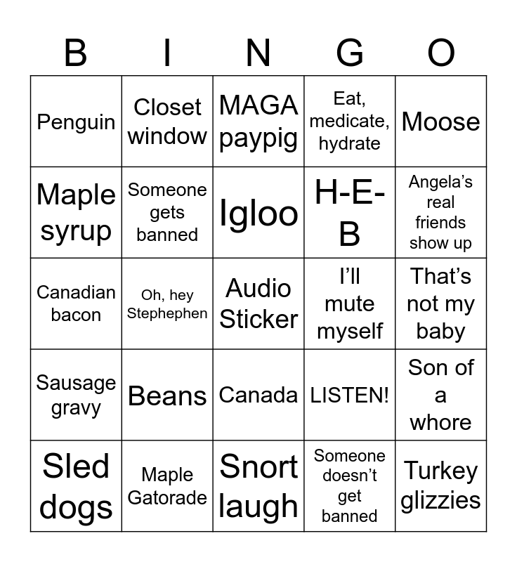 This bingo card has a free space and 24 words: Beans, Maple Gatorade, Igloo, Sled dogs, Moose, Penguin, Maple syrup, Closet window, I’ll mute myself, Canada, H-E-B, Canadian bacon, LISTEN!, Son of a whore, Someone gets banned, Someone doesn’t get banned, That’s not my baby, MAGA paypig, Angela’s real friends show up, Oh, hey Stephephen, Turkey glizzies, Sausage gravy, Eat, medicate, hydrate and Snort laugh.