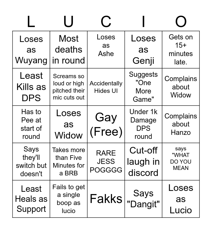 This bingo card has a free space and 24 words: Takes more than Five Minutes for a BRB, Fails to get a single boop as lucio, Accidentally Hides UI, Least Heals as Support, Gets on 15+ minutes late., Loses as Wuyang, Least Kills as DPS, Most deaths in round, Under 1k Damage DPS round, RARE JESS POGGGG, Suggests "One More Game", Has to Pee at start of round, Cut-off laugh in discord, says "WHAT DO YOU MEAN, Screams so loud or high pitched their mic cuts out, Says "Dangit", Complains about Hanzo, Loses as Ashe, Complains about Widow, Loses as Widow, Loses as Lucio, Says they'll switch but doesn't, Loses as Genji and Fakks.