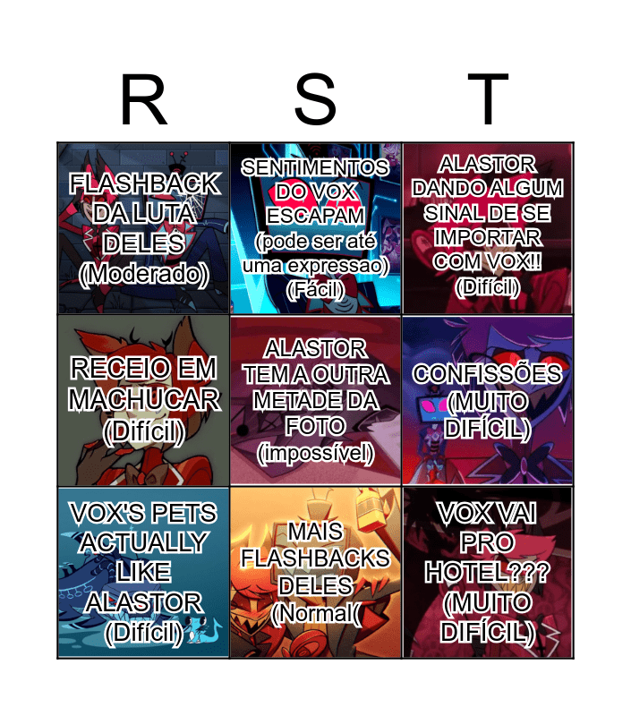 This bingo card has 8 images, a free space and 8 words: CONFISSÕES (MUITO DIFÍCIL), ALASTOR DANDO ALGUM SINAL DE SE IMPORTAR COM VOX!! (Difícil), SENTIMENTOS DO VOX ESCAPAM (pode ser até uma expressao) (Fácil), VOX'S PETS ACTUALLY LIKE ALASTOR (Difícil), FLASHBACK DA LUTA DELES (Moderado), VOX VAI PRO HOTEL??? (MUITO DIFÍCIL), RECEIO EM MACHUCAR (Difícil) and MAIS FLASHBACKS DELES (Normal(.