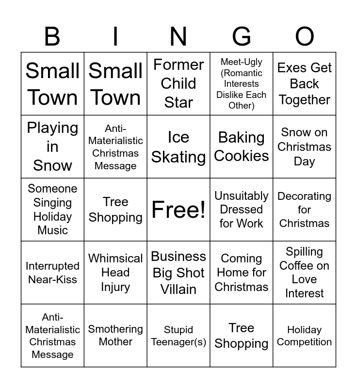 ⚠ This card has duplicate items: Meet-Ugly (Romantic Interests Dislike Each Other) (2), Meet-Cute (2), Former Child Star (2), Former Star With Plastic Surgery (2), Dog(s) Bringing Couple Together (2), Well-Meaning Meddling (2), Arts & Crafts Project (2), Career Change (2), Dead Parent (2), Coming Home for Christmas (2), Snow on Christmas Day (2), Baking Cookies (2), Ice Skating (2), Playing in Snow (2), Decorating for Christmas (2), Tree Shopping (2), Big Relationship Misunderstanding (2), Holiday Competition (2), Family Tradition (2), Exes Get Back Together (2), Newly Single Parent (2), Someone Singing Holiday Music (2), Anti-Materialistic Christmas Message (2), Small Town (2)