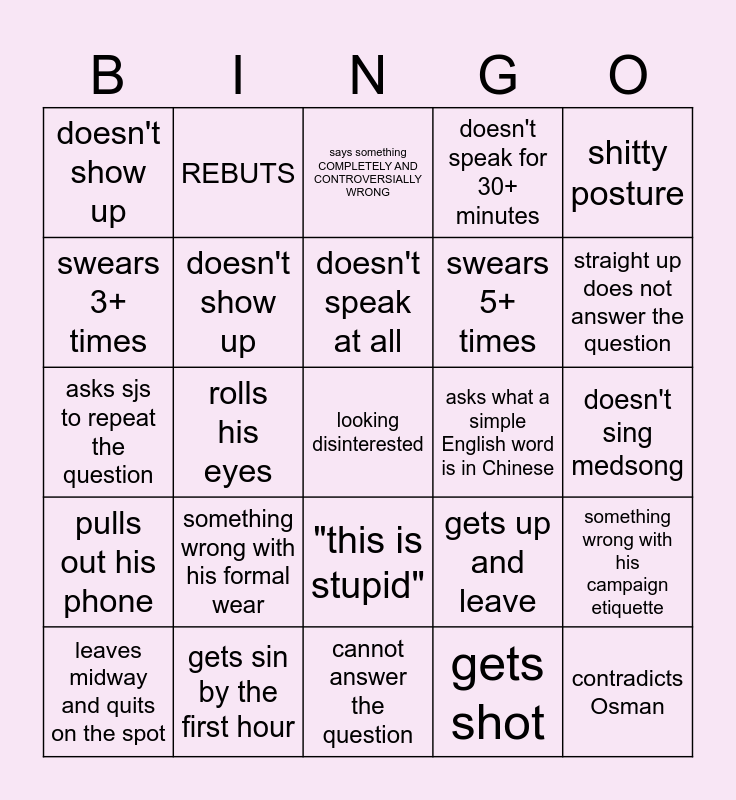 This bingo card has a free space and 24 words: something wrong with his formal wear, gets sin by the first hour, doesn't speak at all, leaves midway and quits on the spot, shitty posture, doesn't show up, swears 3+ times, REBUTS, asks what a simple English word is in Chinese, "this is stupid", swears 5+ times, asks sjs to repeat the question, gets up and leave, something wrong with his campaign etiquette, doesn't show up, gets shot, doesn't sing medsong, says something COMPLETELY AND CONTROVERSIALLY WRONG, straight up does not answer the question, rolls his eyes, contradicts Osman, pulls out his phone, doesn't speak for 30+ minutes and cannot answer the question.