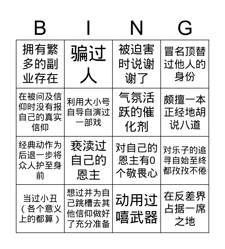 This bingo card has 16 words: 想过并为自己跳槽去其他信仰做好了充分准备, 对乐子的追寻自始至终都孜孜不倦, 被迫害时说谢谢了, 拥有繁多的副业存在, 经典动作为后退一步将众人护至身前, 骗过人, 对自己的恩主有0个敬畏心, 动用过嘻武器, 在被问及信仰时没有报自己的真实信仰, 利用大小号自导自演过一部戏, 当过小丑(各个意义上的都算), 冒名顶替过他人的身份, 亵渎过自己的恩主, 颇擅一本正经地胡说八道, 气氛活跃的催化剂 and 在反差界占据一席之地.