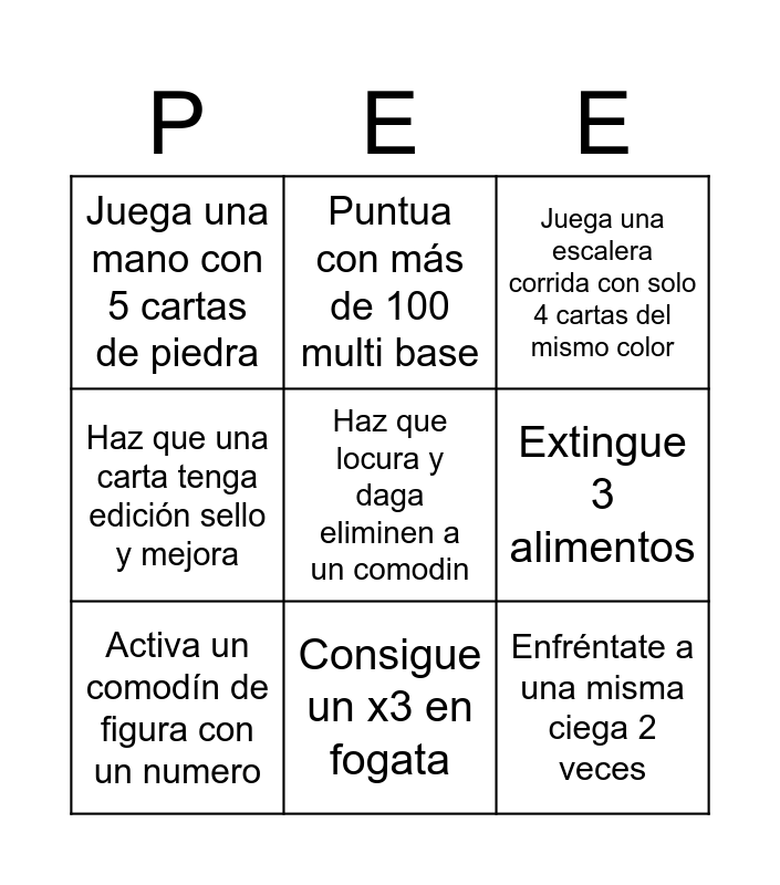 This bingo card has a free space and 8 words: Extingue 3 alimentos, Juega una escalera corrida con solo 4 cartas del mismo color, Puntua con más de 100 multi base, Activa un comodín de figura con un numero, Juega una mano con 5 cartas de piedra, Enfréntate a una misma ciega 2 veces, Haz que una carta tenga edición sello y mejora and Consigue un x3 en fogata.