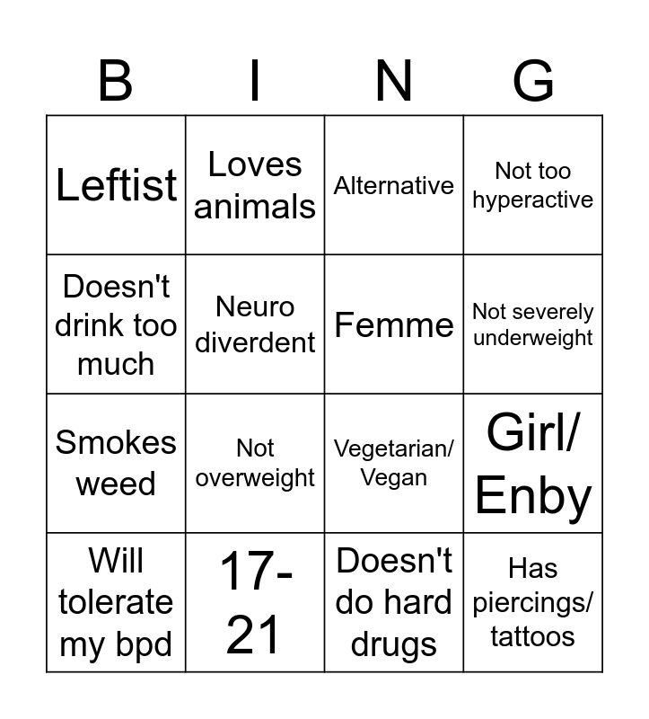 This bingo card has 16 words: 17-21, Girl/ Enby, Alternative, Leftist, Smokes weed, Loves animals, Vegetarian/ Vegan, Doesn't do hard drugs, Doesn't drink too much, Neuro diverdent, Will tolerate my bpd, Not too hyperactive, Not overweight, Not severely underweight, Femme and Has piercings/ tattoos.