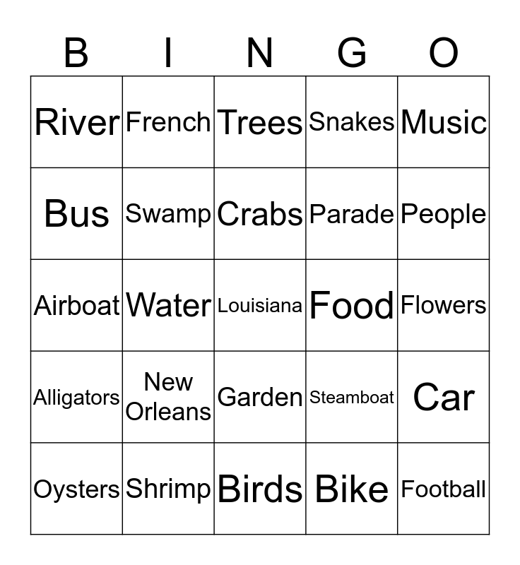 This bingo card has a free space and 24 words: New Orleans, Shrimp, Crabs, Oysters, Music, River, Bus, French, Food, Garden, Parade, Airboat, Steamboat, Car, Swamp, Bike, Flowers, Trees, People, Water, Football, Alligators, Snakes and Birds.