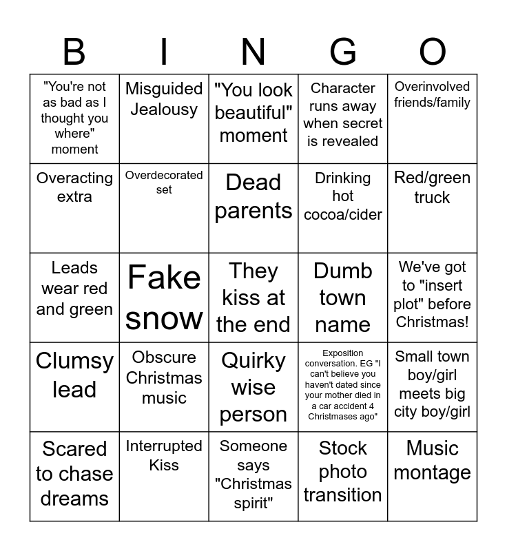 This bingo card has a free space and 24 words: Obscure Christmas music, Interrupted Kiss, Dead parents, Scared to chase dreams, Overinvolved friends/family, "You're not as bad as I thought you where" moment, Overacting extra, Misguided Jealousy, Dumb town name, Quirky wise person, Drinking hot cocoa/cider, Leads wear red and green, Exposition conversation. EG "I can't believe you haven't dated since your mother died in a car accident 4 Christmases ago", Small town boy/girl meets big city boy/girl, Overdecorated set, Stock photo transition, We've got to "insert plot" before Christmas!, "You look beautiful" moment, Red/green truck, Fake snow, Music montage, Clumsy lead, Character runs away when secret is revealed and Someone says "Christmas spirit".