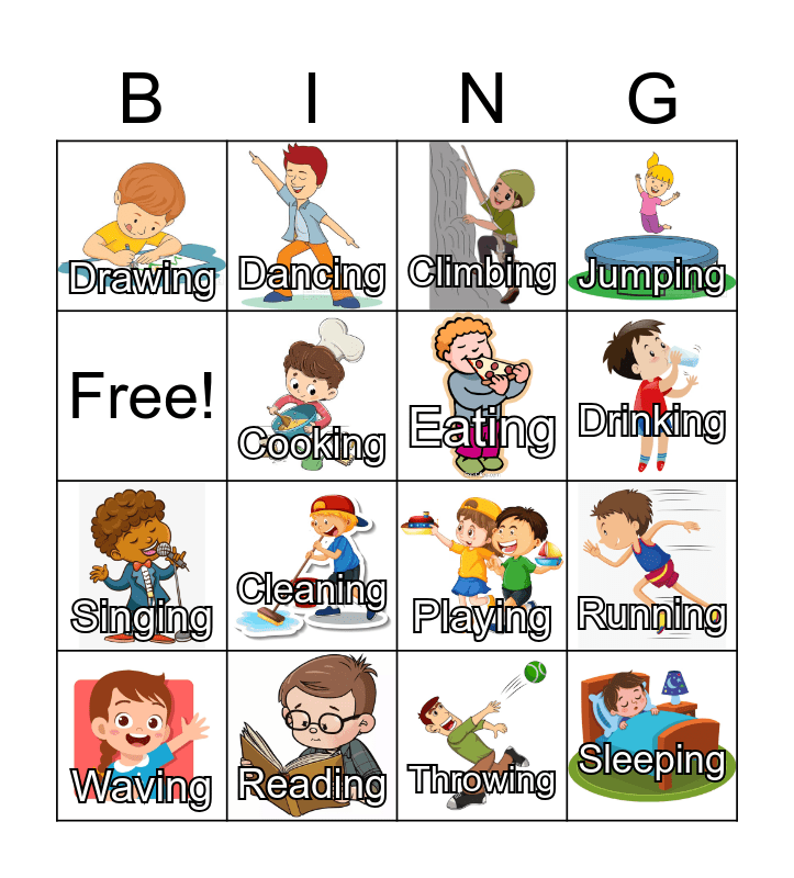 This bingo card has 15 images and 16 words: Reading, Running, Climbing, Drawing, Singing, Dancing, Playing, Throwing, Free!, Cooking, Waving, Jumping, Cleaning, Drinking, Eating and Sleeping.