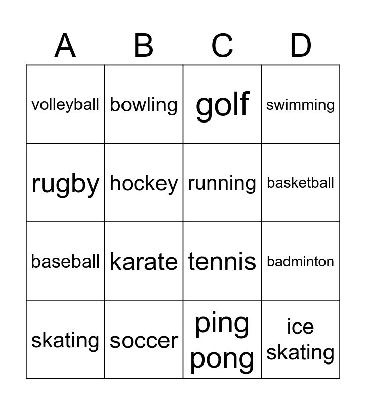 This bingo card has 16 words: soccer, badminton, golf, volleyball, baseball, bowling, tennis, ping pong, rugby, hockey, skating, swimming, karate, basketball, running and ice skating.