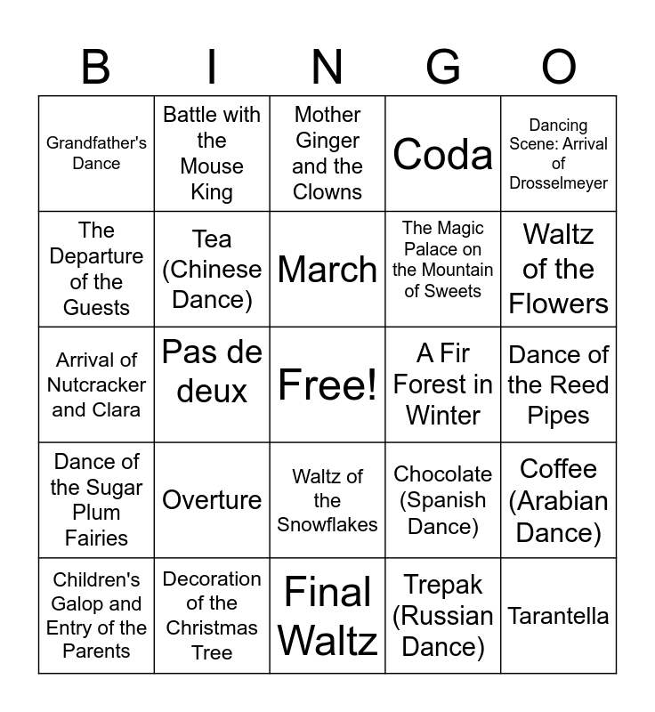 This bingo card has a free space and 24 words: Overture, Decoration of the Christmas Tree, March, Children's Galop and Entry of the Parents, Dancing Scene: Arrival of Drosselmeyer, Grandfather's Dance, The Departure of the Guests, Battle with the Mouse King, A Fir Forest in Winter, Waltz of the Snowflakes, The Magic Palace on the Mountain of Sweets, Arrival of Nutcracker and Clara, Chocolate (Spanish Dance), Coffee (Arabian Dance), Tea (Chinese Dance), Trepak (Russian Dance), Dance of the Reed Pipes, Mother Ginger and the Clowns, Waltz of the Flowers, Pas de deux, Tarantella, Dance of the Sugar Plum Fairies, Coda and Final Waltz.