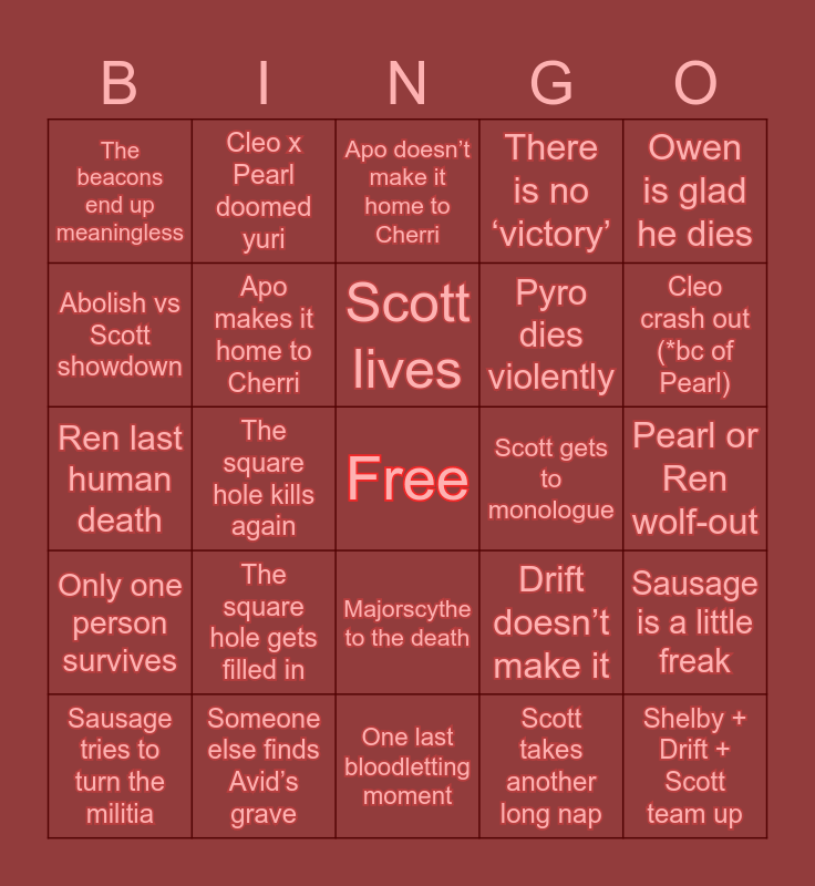 This bingo card has a free space and 34 words: Ren first human death, Shelby gets a kill, A vampire gets cured forcefully (*Scott), Pearl gets turned, Pearl or Ren wolf-out, Abolish vs Scott showdown, Apo makes it home to Cherri, One last bloodletting moment, Pyro dies violently, Shelby + Drift + Scott team up, Ren last human death, Cleo x Pearl doomed yuri, Scott takes another long nap, Someone self sacrifice (*Legs), Only one person survives, The square hole kills again, Majorscythe to the death, Scott gets to monologue, Sausage is a little freak, Sausage tries to turn the militia, Someone else finds Avid’s grave, Legs does harm, There is no ‘victory’, Cleo crash out (*bc of Pearl), Militia + vampire team up, The square hole gets filled in, Apo doesn’t make it home to Cherri, Someone talks at Avid’s grave (*Shelby or Drift), Owen is glad he dies, The beacons end up meaningless, Martyn or Legs uses the cure, Scott lives, Drift doesn’t make it and More arson.