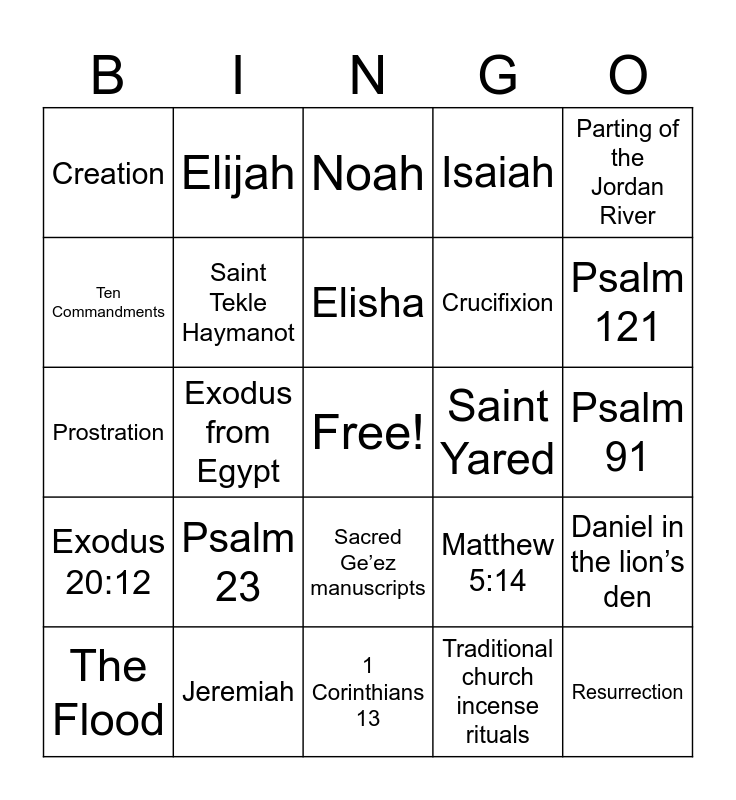 This bingo card has a free space and 85 words: Adam, Eve, Noah, Abraham, Moses, King David, Queen of Sheba, Mary, Jesus, John the Baptist, Apostle Peter, Apostle Paul, Saint Tekle Haymanot, Saint Yared, Joseph, Creation, The Flood, Ten Commandments, Crossing the Red Sea, Birth of Jesus, Baptism of Jesus, Crucifixion, Resurrection, Pentecost, Exodus from Egypt, David defeats Goliath, Ark of the Covenant, Burning Bush, Feeding 5,000, Jesus walks on water, Psalm 23, John 3:16, Lord’s Prayer, Prostration, Ten Commandments summary, Proverbs 3:5-6, 1 Corinthians 13, Genesis 1:1, Exodus 20:12, Psalm 121, Cross, Tabot, Censer/incense, Candle, Meskel (Finding of the True Cross), Timqet (Epiphany), Fasting (Wednesday & Friday), Pilgrimage, Sacred chant, Holy Synod, Elijah, Elisha, Esther, Joshua, Gideon, Samuel, Jeremiah, Isaiah, Habakkuk, Jonah, Martha, Lazarus, Simeon, Jacob’s ladder, Joseph interprets dreams, Parting of the Jordan River, Samson and Delilah, Daniel in the lion’s den, Jonah and the whale, Solomon’s temple built, Crossing the Jordan into Canaan, Jesus heals the blind, Jesus raises Lazarus, Fasting during Lent, Celebration of saints’ feast days, Sacred Ge’ez manuscripts, Traditional church incense rituals, Ethiopian icon painting, Holy water sprinkling, Prostration (kneeling in prayer), Psalm 91, Psalm 46, Isaiah 40:31, Matthew 5:14 and Ephesians 6:10.