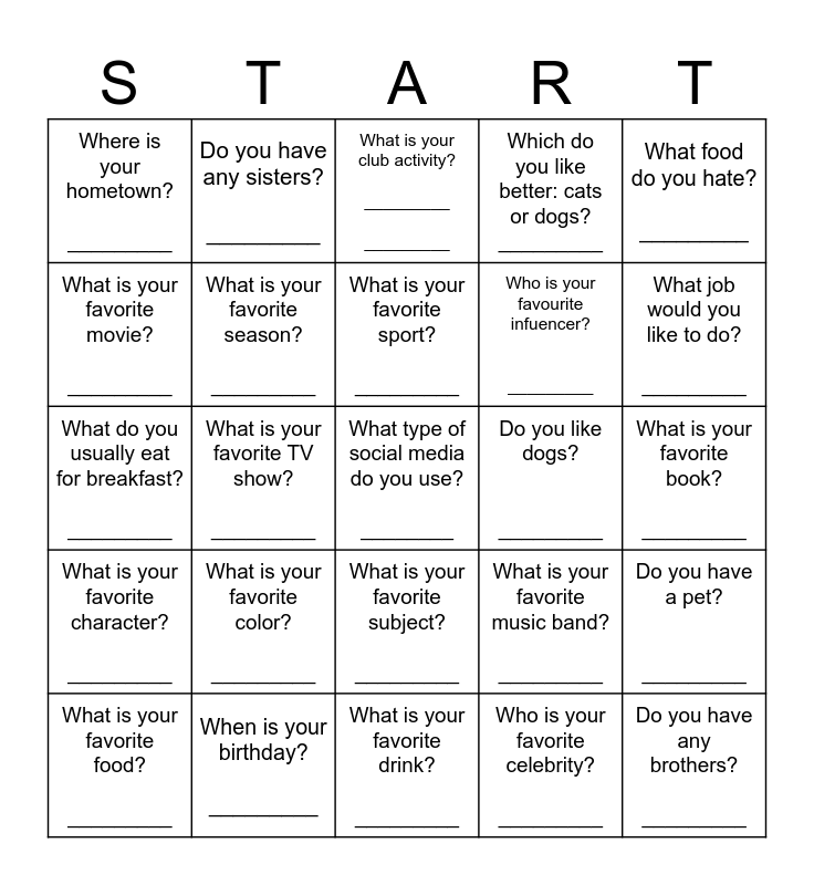 This bingo card has a free space and 24 words: What is your favorite color? _________, When is your birthday? _________, What is your favorite sport? _________, What is your favorite food? _________, What food do you hate? _________, Where is your hometown? _________, What is your favorite movie? _________, Do you have any sisters? _________, Do you like dogs? _________, What is your favorite subject? _________, Who is your favourite infuencer? _________, What do you usually eat for breakfast? _________, What is your favorite music band? _________, Do you have a pet? _________, What is your favorite season? _________, Who is your favorite celebrity? _________, What is your favorite book? _________, What is your club activity? _________ _________, What job would you like to do? _________, What is your favorite TV show? _________, Do you have any brothers? _________, What is your favorite character? _________, Which do you like better: cats or dogs? _________ and What is your favorite drink? _________.