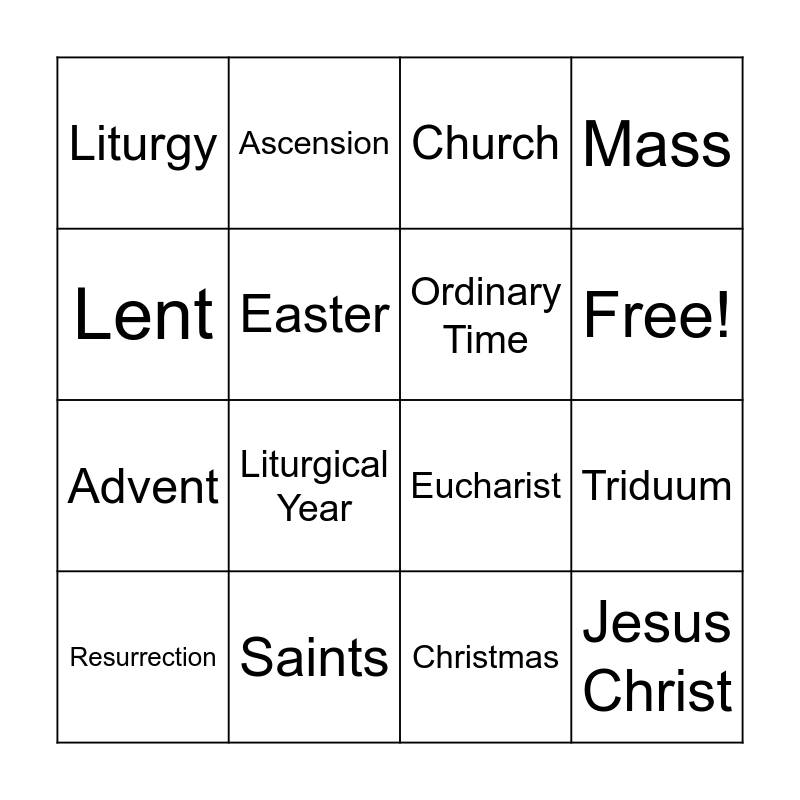 This bingo card has 18 words: Liturgical Year, Jesus Christ, Church, Liturgy, Eucharist, Mass, Resurrection, Ascension, Free!, Advent, Christmas, Lent, Triduum, Easter, Ordinary Time, Mary, Saints and Good Friday.