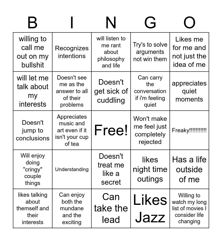 This bingo card has a free space and 24 words: Understanding, Can enjoy both the mundane and the exciting, Doesn't get sick of cuddling, likes talking about themself and their interests, Likes me for me and not just the idea of me, willing to call me out on my bullshit, will let me talk about my interests, Recognizes intentions, Won't make me feel just completely rejected, Doesn't treat me like a secret, Can carry the conversation if i'm feeling quiet, Doesn't jump to conclusions, likes night time outings, Has a life outside of me, Doesn't see me as the answer to all of their problems, Likes Jazz, Freaky!!!!!!!!!!!, will listen to me rant about philosophy and life, appreciates quiet moments, Appreciates music and art even if it isn't your cup of tea, Willing to watch my long list of movies I consider life changing, Will enjoy doing "cringy" couple things, Try's to solve arguments not win them and Can take the lead.