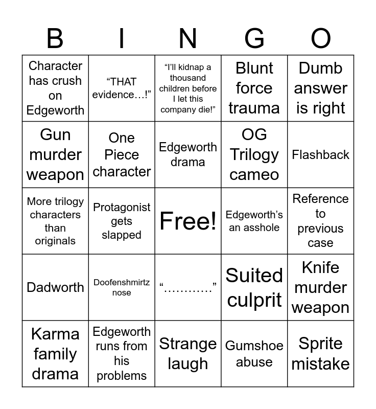 This bingo card has a free space and 24 words: Doofenshmirtz nose, Edgeworth runs from his problems, Edgeworth drama, Karma family drama, Dumb answer is right, Character has crush on Edgeworth, Gun murder weapon, “THAT evidence…!”, Edgeworth’s an asshole, “…………”, OG Trilogy cameo, More trilogy characters than originals, Suited culprit, Knife murder weapon, One Piece character, Gumshoe abuse, Reference to previous case, “I’ll kidnap a thousand children before I let this company die!”, Flashback, Protagonist gets slapped, Sprite mistake, Dadworth, Blunt force trauma and Strange laugh.