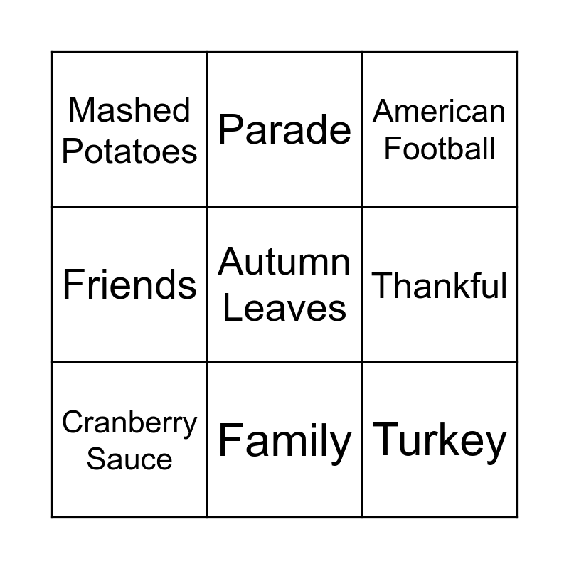 This bingo card has a free space and 14 words: Pumpkin Pie, Meal, Cranberry Sauce, Parade, Friends, Turkey, Thanksgiving, Dog Show, Family, Mashed Potatoes, Food, Thankful, American Football and USA.