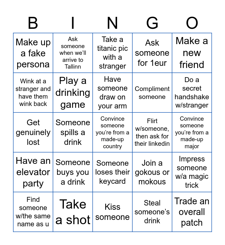 This bingo card has 30 words: Take a shot, Play beerpong on a door, Someone spills a drink, Someone throws up, Make up a fake persona, Take a titanic pic with a stranger, Play a drinking game, Someone loses their keycard, Flirt w/someone, then ask for their linkedin, Kiss someone, Convince someone you’re from a made-up major, Convince someone you’re from a made-up country, Steal someone’s drink, Trade an overall patch, Do a secret handshake w/stranger, Sing karaoke, Join a gokous or mokous, Have an elevator party, Someone buys you a drink, Make a new friend, Get genuinely lost, Take a pic of u and something golden, Ask someone when we’ll arrive to Tallinn, Compliment someone, Wink at a stranger and have them wink back, Ask someone for 1eur, Impress someone w/a magic trick, Find someone w/the same name as u, Have someone draw on your arm and Take a pic of something funny.
