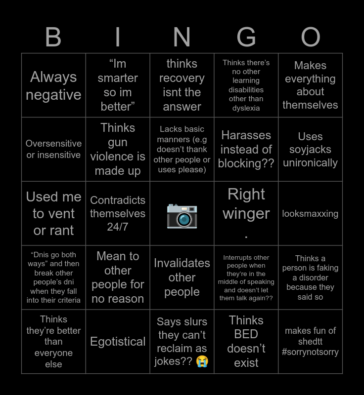 This bingo card has a free space and 24 words: Mean to other people for no reason, Egotistical, Lacks basic manners (e.g doesn’t thank other people or uses please), Thinks they’re better than everyone else, Makes everything about themselves, Always negative, Oversensitive or insensitive, “Im smarter so im better”, Right winger ., Invalidates other people, Harasses instead of blocking??, Used me to vent or rant, Interrupts other people when they’re in the middle of speaking and doesn’t let them talk again??, Thinks a person is faking a disorder because they said so, Thinks gun violence is made up, Thinks BED doesn’t exist, looksmaxxing, thinks recovery isnt the answer, Uses soyjacks unironically, Contradicts themselves 24/7, makes fun of shedtt #sorrynotsorry, “Dnis go both ways” and then break other people’s dni when they fall into their criteria, Thinks there’s no other learning disabilities other than dyslexia and Says slurs they can’t reclaim as jokes?? 😭.