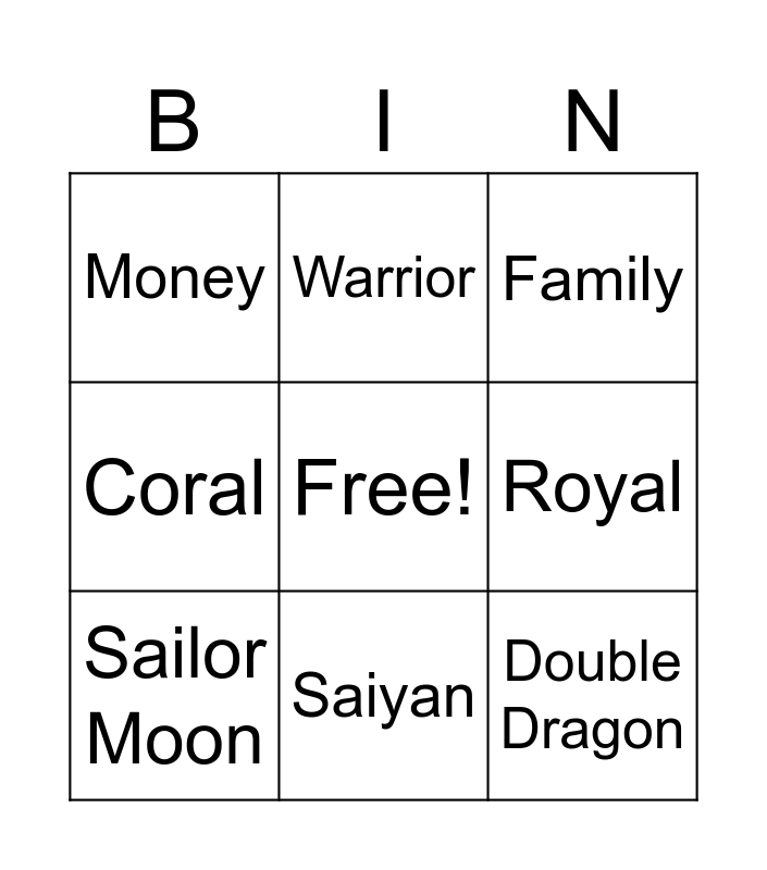 This bingo card has a free space and 8 words: Royal, Family, Warrior, Sailor Moon, Money, Double Dragon, Coral and Saiyan.