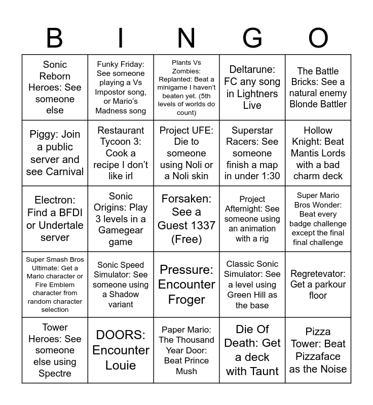 This bingo card has a free space and 24 words: Sonic Speed Simulator: See someone using a Shadow variant, DOORS: Encounter Louie, Project UFE: Die to someone using Noli or a Noli skin, Tower Heroes: See someone else using Spectre, The Battle Bricks: See a natural enemy Blonde Battler, Sonic Reborn Heroes: See someone else, Piggy: Join a public server and see Carnival, Funky Friday: See someone playing a Vs Impostor song, or Mario’s Madness song, Project Afternight: See someone using an animation with a rig, Pressure: Encounter Froger, Superstar Racers: See someone finish a map in under 1:30, Electron: Find a BFDI or Undertale server, Classic Sonic Simulator: See a level using Green Hill as the base, Regretevator: Get a parkour floor, Restaurant Tycoon 3: Cook a recipe I don’t like irl, Die Of Death: Get a deck with Taunt, Super Mario Bros Wonder: Beat every badge challenge except the final final challenge, Plants Vs Zombies: Replanted: Beat a minigame I haven’t beaten yet. (5th levels of worlds do count), Hollow Knight: Beat Mantis Lords with a bad charm deck, Sonic Origins: Play 3 levels in a Gamegear game, Pizza Tower: Beat Pizzaface as the Noise, Super Smash Bros Ultimate: Get a Mario character or Fire Emblem character from random character selection, Deltarune: FC any song in Lightners Live and Paper Mario: The Thousand Year Door: Beat Prince Mush.