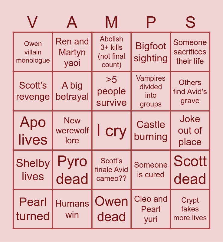 This bingo card has a free space and 24 words: Pyro dead, Humans win, >5 people survive, Pearl turned, Someone sacrifices their life, Owen villain monologue, Scott's revenge, Ren and Martyn yaoi, Castle burning, Scott's finale Avid cameo??, Vampires divided into groups, Apo lives, Someone is cured, Scott dead, A big betrayal, Cleo and Pearl yuri, Joke out of place, Abolish 3+ kills (not final count), Others find Avid's grave, New werewolf lore, Crypt takes more lives, Shelby lives, Bigfoot sighting and Owen dead.