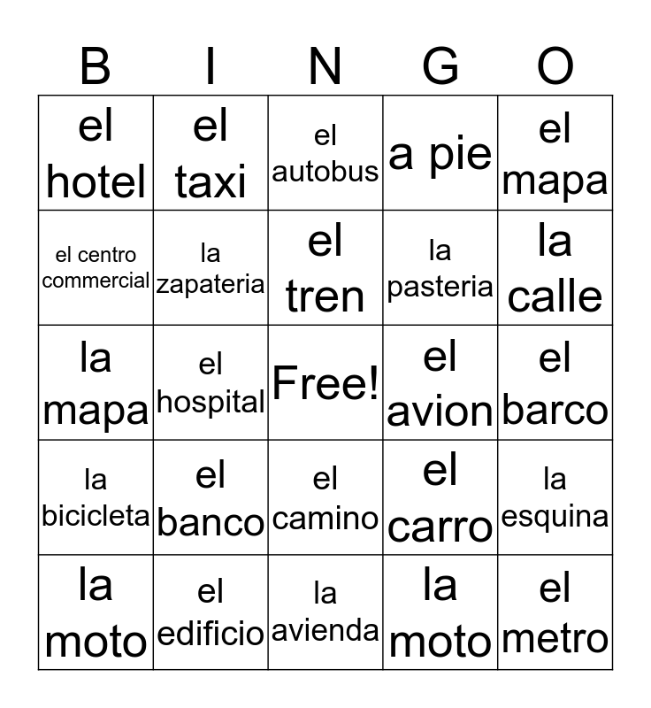 This bingo card has a free space and 24 words: el banco, el edificio, el tren, la moto, el mapa, el hotel, el centro commercial, el taxi, el avion, el camino, la pasteria, la mapa, el carro, la esquina, la zapateria, la moto, el barco, el autobus, la calle, el hospital, el metro, la bicicleta, a pie and la avienda.