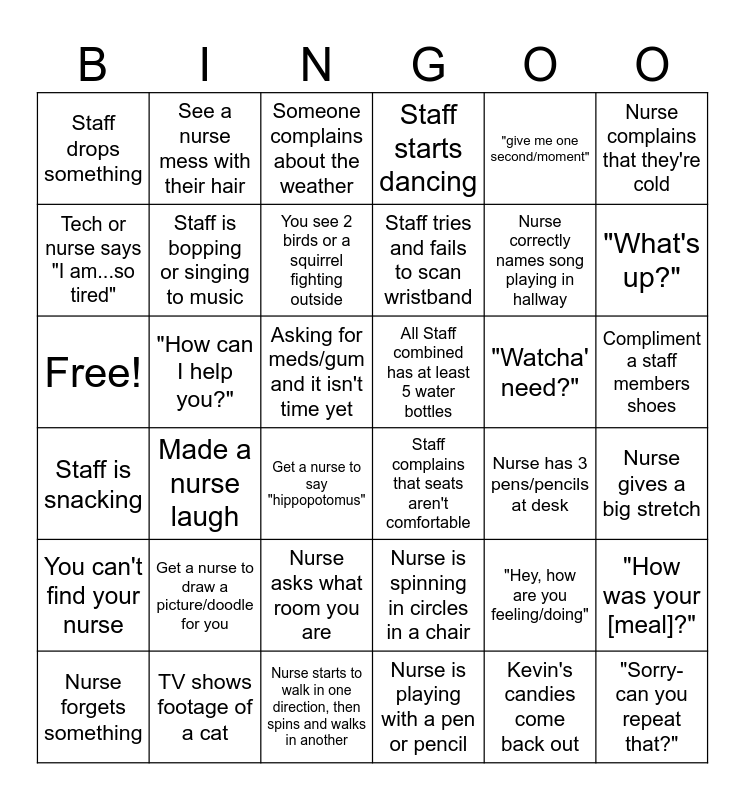 This bingo card has 36 words: Nurse is spinning in circles in a chair, Nurse asks what room you are, Nurse is playing with a pen or pencil, Tech or nurse says "I am...so tired", Staff is snacking, All Staff combined has at least 5 water bottles, Staff is bopping or singing to music, Nurse starts to walk in one direction, then spins and walks in another, "give me one second/moment", "Hey, how are you feeling/doing", "What's up?", Staff starts dancing, "How was your [meal]?", "How can I help you?", Staff tries and fails to scan wristband, Staff drops something, You can't find your nurse, "Watcha' need?", Free!, Someone complains about the weather, Asking for meds/gum and it isn't time yet, Made a nurse laugh, Staff complains that seats aren't comfortable, Get a nurse to say "hippopotomus", Nurse has 3 pens/pencils at desk, See a nurse mess with their hair, Nurse correctly names song playing in hallway, TV shows footage of a cat, You see 2 birds or a squirrel fighting outside, Nurse complains that they're cold, "Sorry- can you repeat that?", Nurse forgets something, Nurse gives a big stretch, Compliment a staff members shoes, Get a nurse to draw a picture/doodle for you and Kevin's candies come back out.