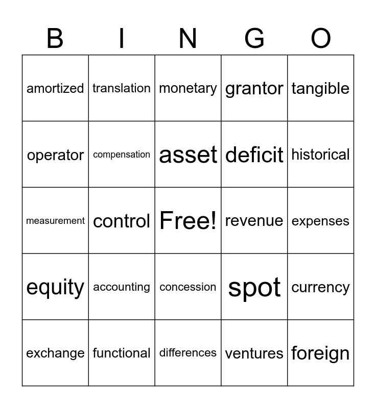 This bingo card has a free space and 35 words: service, arrangement, binding, compensation, concession, grantor, operator, recognition, asset, residual, measurement, tangible, liability, payments, amortized, revenue, ventures, control, equity, foreign, spot, exchange, currency, functional, monetary, historical, gain, non-monetary, deficit, expenses, rate, differences, accounting, translation and entities.