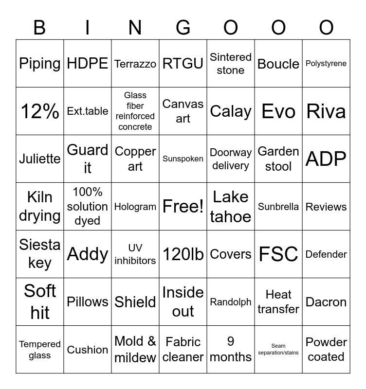 This bingo card has a free space and 55 words: 9 months, ADP, Loveseat, Piping, 100% solution dyed, Pillows, Polystyrene, Koda, Ext.table, Shield, RTGU, Defender, Reviews, Sunbrella, Tempered glass, Siesta key, Sintered stone, Calay, Seam separation/stains, Evo, Riva, Addy, Doorway delivery, Terrazzo, Visit summary, 12%, Hologram, Sunbelievable, Juliette, Garden stool, Add a pad, FSC, Dacron, Cushion, Boucle, Canvas art, Soft hit, Guard it, Powder coated, UV inhibitors, HDPE, Inside out, Randolph, Checking, Copper art, Kiln drying, Mold & mildew, Covers, Lake tahoe, Glass fiber reinforced concrete, 120lb, Heat transfer, Fabric cleaner, Sunspoken and Oscar.