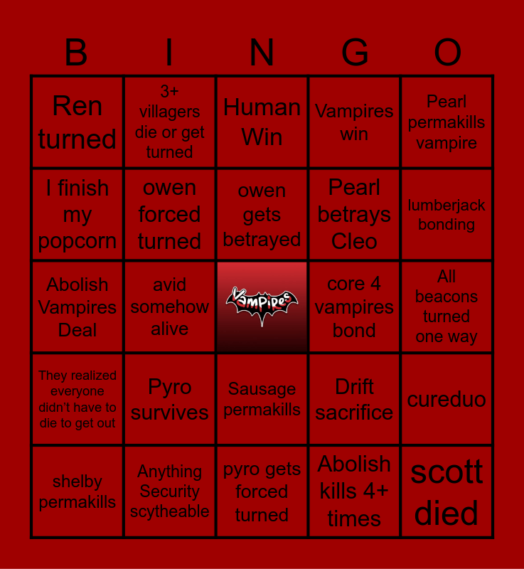 This bingo card has a free space and 24 words: Pyro survives, Anything Security scytheable, owen gets betrayed, shelby permakills, Pearl permakills vampire, Ren turned, I finish my popcorn, 3+ villagers die or get turned, core 4 vampires bond, Sausage permakills, Pearl betrays Cleo, Abolish Vampires Deal, Drift sacrifice, cureduo, owen forced turned, Abolish kills 4+ times, All beacons turned one way, Human Win, lumberjack bonding, avid somehow alive, scott died, They realized everyone didn’t have to die to get out, Vampires win and pyro gets forced turned.