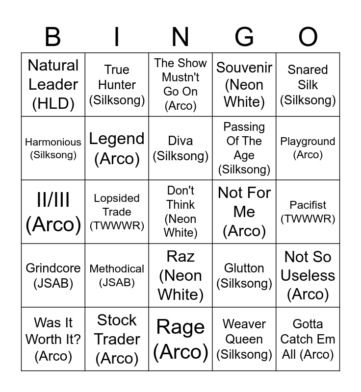 This bingo card has 25 words: Methodical (JSAB), Rage (Arco), Diva (Silksong), Was It Worth It? (Arco), Snared Silk (Silksong), Natural Leader (HLD), Harmonious (Silksong), True Hunter (Silksong), Not For Me (Arco), Raz (Neon White), Passing Of The Age (Silksong), II/III (Arco), Glutton (Silksong), Not So Useless (Arco), Legend (Arco), Gotta Catch Em All (Arco), Pacifist (TWWWR), The Show Mustn't Go On (Arco), Playground (Arco), Lopsided Trade (TWWWR), Don't Think (Neon White), Stock Trader (Arco), Grindcore (JSAB), Souvenir (Neon White) and Weaver Queen (Silksong).