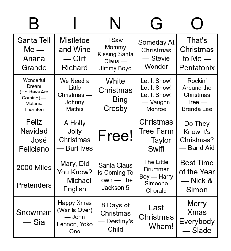 This bingo card has a free space and 25 words: Mary, Did You Know? — Michael English, 8 Days of Christmas — Destiny's Child, White Christmas — Bing Crosby, Snowman — Sia, That's Christmas to Me — Pentatonix, Santa Tell Me — Ariana Grande, Wonderful Dream (Holidays Are Coming) — Melanie Thornton, Mistletoe and Wine — Cliff Richard, Christmas Tree Farm — Taylor Swift, Santa Claus Is Coming To Town — The Jackson 5, Let It Snow! Let It Snow! Let It Snow! — Vaughn Monroe, Feliz Navidad — José Feliciano, The Little Drummer Boy — Harry Simeone Chorale, Best Time of the Year — Nick & Simon, We Need a Little Christmas — Johnny Mathis, Christmas Time — Bryan Adams, Do They Know It's Christmas? — Band Aid, I Saw Mommy Kissing Santa Claus — Jimmy Boyd, Rockin' Around the Christmas Tree — Brenda Lee, A Holly Jolly Christmas — Burl Ives, Merry Xmas Everybody — Slade, Happy Xmas (War Is Over) — John Lennon, Yoko Ono, 2000 Miles — Pretenders, Someday At Christmas — Stevie Wonder and Last Christmas — Wham!.