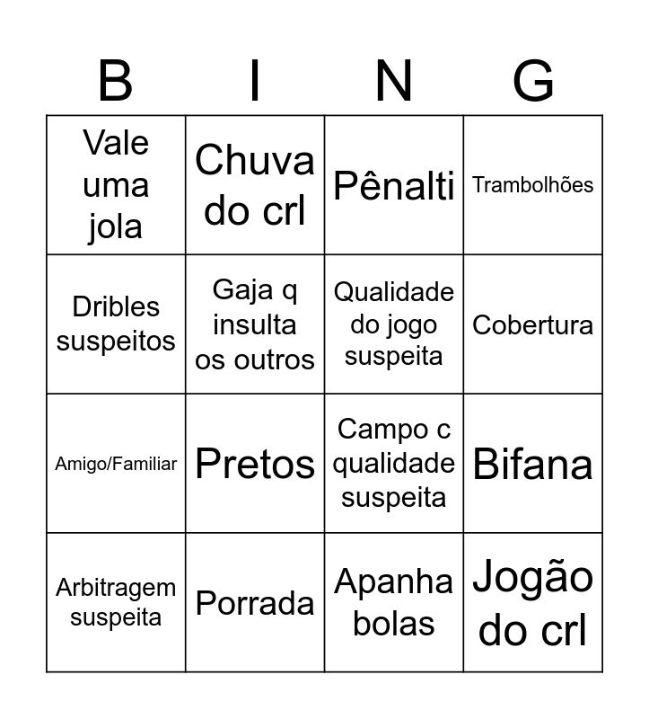 This bingo card has 16 words: Arbitragem suspeita, Porrada, Pênalti, Trambolhões, Dribles suspeitos, Chuva do crl, Campo c qualidade suspeita, Bifana, Vale uma jola, Gaja q insulta os outros, Apanha bolas, Cobertura, Amigo/Familiar, Pretos, Qualidade do jogo suspeita and Jogão do crl.
