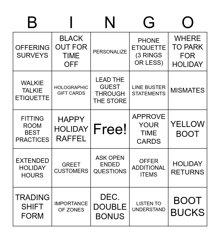 This bingo card has a free space and 24 words: GREET CUSTOMERS, IMPORTANCE OF ZONES, LEAD THE GUEST THROUGH THE STORE, TRADING SHIFT FORM, WHERE TO PARK FOR HOLIDAY, OFFERING SURVEYS, WALKIE TALKIE ETIQUETTE, BLACK OUT FOR TIME OFF, APPROVE YOUR TIME CARDS, ASK OPEN ENDED QUESTIONS, LINE BUSTER STATEMENTS, FITTING ROOM BEST PRACTICES, OFFER ADDITIONAL ITEMS, HOLIDAY RETURNS, HOLOGRAPHIC GIFT CARDS, LISTEN TO UNDERSTAND, YELLOW BOOT, PERSONALIZE, MISMATES, HAPPY HOLIDAY RAFFEL, BOOT BUCKS, EXTENDED HOLIDAY HOURS, PHONE ETIQUETTE (3 RINGS OR LESS) and DEC. DOUBLE BONUS.