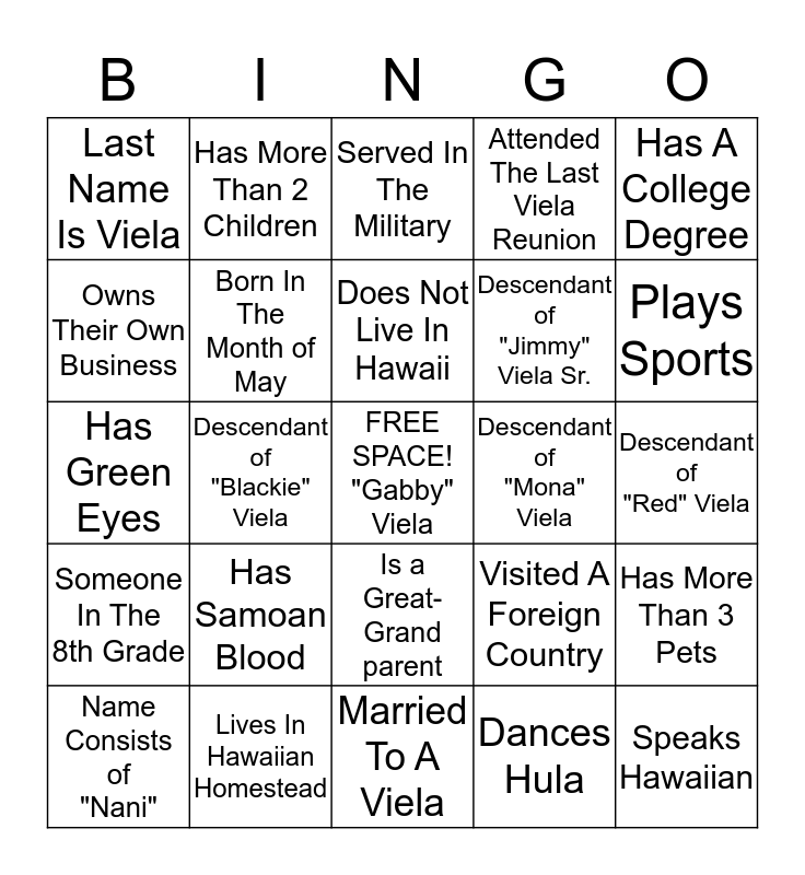 This bingo card has a free space and 24 words: Has Samoan Blood, Lives In Hawaiian Homestead, Does Not Live In Hawaii, Name Consists of "Nani", Has A College Degree, Last Name Is Viela, Owns Their Own Business, Has More Than 2 Children, Descendant of "Mona" Viela, Is a Great-Grand parent, Descendant of "Jimmy" Viela Sr., Has Green Eyes, Visited A Foreign Country, Has More Than 3 Pets, Born In The Month of May, Dances Hula, Descendant of "Red" Viela, Served In The Military, Plays Sports, Descendant of "Blackie" Viela, Speaks Hawaiian, Someone In The 8th Grade, Attended The Last Viela Reunion and Married To A Viela.