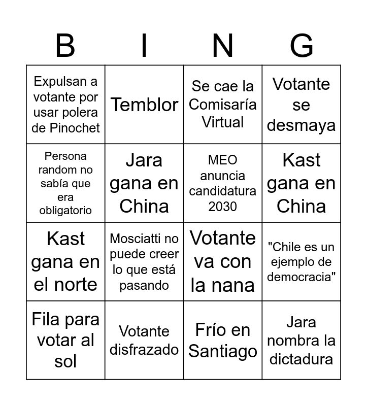 This bingo card has 45 words: Vocal de mesa se arranca, Fila para votar al sol, Votante se equivoca de lugar, Boric va a votar con la guagua, Artes pelea con periodista, "vine a cumplir con mi deber cívico", Se cae la Comisaría Virtual, Cortan transmisión por qué está votando un candidato, Persona random no sabía que era obligatorio, Entrevistan a votante con más de 100 años, Votante se desmaya, Votante disfrazado, "La fiesta de la democracia", Pantalla dividida, todas del Estado Nacional, Jara se salta la fila, El viento vuela las papeletas, Votante va con sus mascotas, Votante va con la nana, Periodista no puede pronunciar "sufragio", Mosciatti no puede creer lo que está pasando, Temblor, Calor en santiago, Dia lindo en Punta Arenas, Expulsan a votante por usar polera de Pinochet, Votante en silla de ruedas vota en segundo piso de liceo, Frío en Santiago, Día feo en Punta Arenas, Kaiser menciona a Trump, Periodista no alcanza a hacer su pregunta, Jara nombra la dictadura, Matthei nombra la dictadura, Perrito se roba los votos, Vocal de mesa almorzando encima de las papeletas, No hay segunda vuelta, Parisi se hace el chistoso, "Chile es un ejemplo de democracia", Gente haciendo fila con los votos en la mano, Votante se aburre y se va, Se pierde urna, Kast gana en China, Jara gana en China, Kast gana en el norte, MEO anuncia su retiro, MEO anuncia candidatura 2030 and Votante se equivoca de urna.