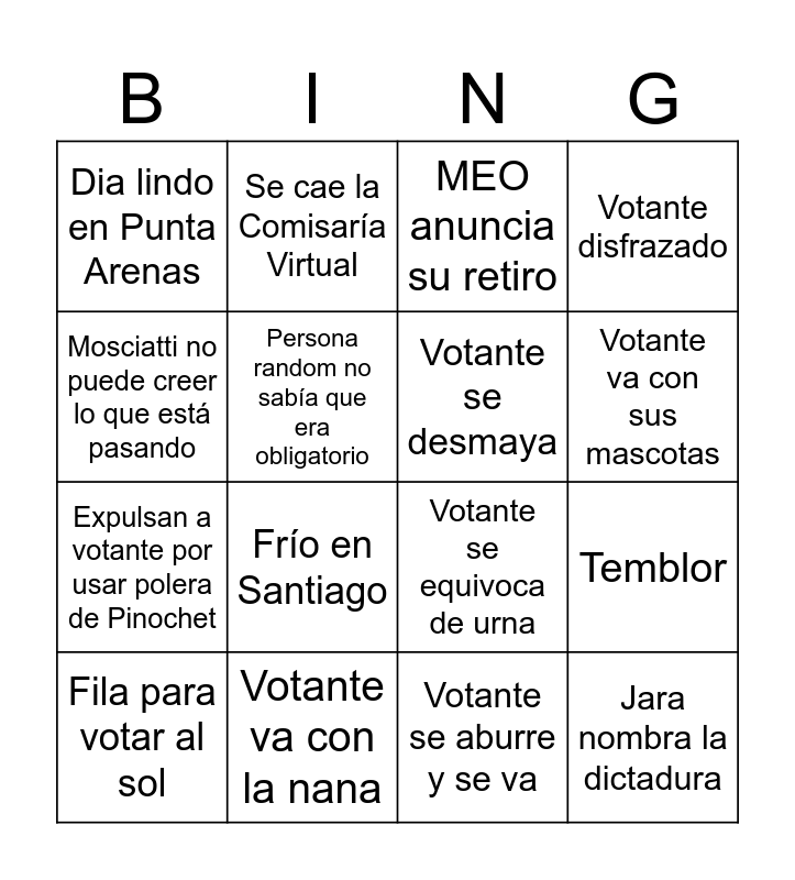This bingo card has 48 words: Vocal de mesa se arranca, Fila para votar al sol, Votante se equivoca de lugar, Boric va a votar con la guagua, Artes pelea con periodista, "vine a cumplir con mi deber cívico", Se cae la Comisaría Virtual, Cortan transmisión por qué está votando un candidato, Persona random no sabía que era obligatorio, Entrevistan a votante con más de 100 años, Votante se desmaya, Votante disfrazado, "La fiesta de la democracia", Pantalla dividida, todas del Estado Nacional, Jara se salta la fila, El viento vuela las papeletas, Votante va con sus mascotas, Votante va con la nana, Periodista no puede pronunciar "sufragio", Mosciatti no puede creer lo que está pasando, Temblor, Calor en santiago, Dia lindo en Punta Arenas, Expulsan a votante por usar polera de Pinochet, Votante en silla de ruedas vota en segundo piso de liceo, Frío en Santiago, Día feo en Punta Arenas, Kaiser menciona a Trump, Periodista no alcanza a hacer su pregunta, Jara nombra la dictadura, Matthei nombra la dictadura, Perrito se roba los votos, Vocal de mesa almorzando encima de las papeletas, No hay segunda vuelta, Parisi se hace el chistoso, "Chile es un ejemplo de democracia", Gente haciendo fila con los votos en la mano, Votante se aburre y se va, Se pierde urna, Kast gana en China, Jara gana en China, Kast gana en el norte, MEO anuncia su retiro, MEO anuncia candidatura 2030, Votante se equivoca de urna, Denuncia por video de TikTok, Vocal de Mesa disfrazado and Candidato olvida la cédula por hablar con periodistas.