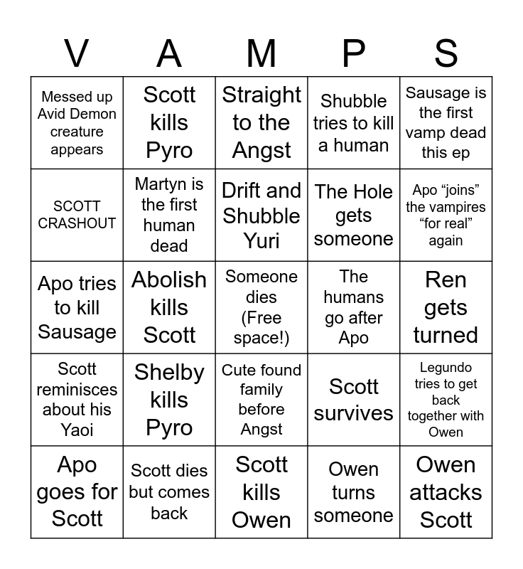 This bingo card has a free space and 24 words: Shelby kills Pyro, Scott dies but comes back, Drift and Shubble Yuri, Apo goes for Scott, Sausage is the first vamp dead this ep, Messed up Avid Demon creature appears, SCOTT CRASHOUT, Scott kills Pyro, The humans go after Apo, Cute found family before Angst, The Hole gets someone, Apo tries to kill Sausage, Scott survives, Legundo tries to get back together with Owen, Martyn is the first human dead, Owen turns someone, Ren gets turned, Straight to the Angst, Apo “joins” the vampires “for real” again, Abolish kills Scott, Owen attacks Scott, Scott reminisces about his Yaoi, Shubble tries to kill a human and Scott kills Owen.