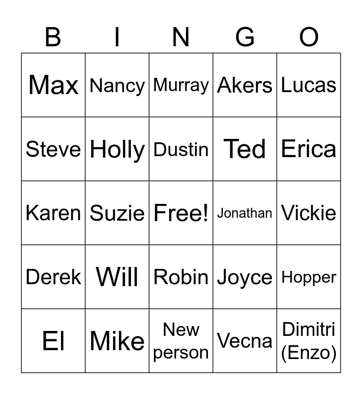 This bingo card has a free space and 24 words: Will, Mike, Dustin, El, Lucas, Max, Steve, Nancy, Jonathan, Robin, Ted, Karen, Joyce, Hopper, Holly, Vecna, Vickie, Murray, Erica, Suzie, Dimitri (Enzo), Derek, Akers and New person.