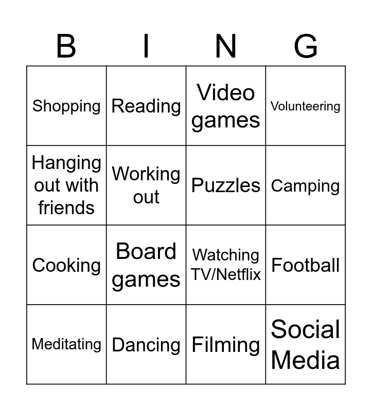 This bingo card has 16 words: Dancing, Football, Video games, Shopping, Cooking, Reading, Watching TV/Netflix, Filming, Hanging out with friends, Working out, Meditating, Volunteering, Board games, Camping, Puzzles and Social Media.