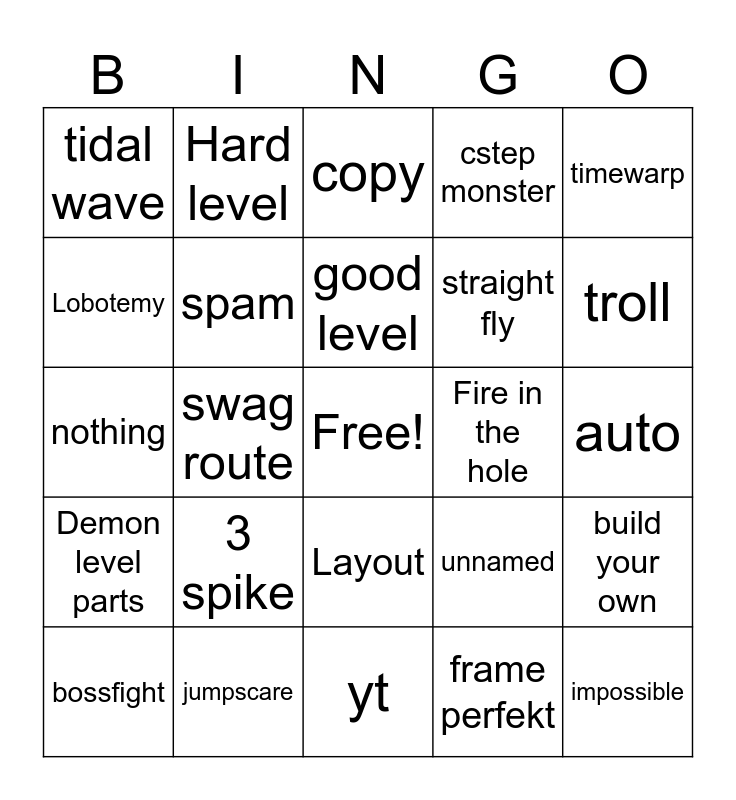 This bingo card has a free space and 24 words: 3 spike, jumpscare, good level, bossfight, timewarp, tidal wave, Lobotemy, Hard level, Fire in the hole, Layout, straight fly, nothing, unnamed, build your own, spam, frame perfekt, auto, copy, troll, swag route, impossible, Demon level parts, cstep monster and yt.