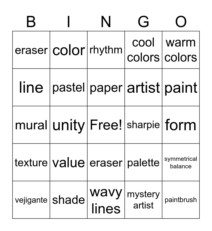 This bingo card has a free space and 50 words: portrait, shade, clay, zentangles, form, picture, color, complementary colors, artist, patterns, eraser, pastel, wavy lines, mystery artist, tertiary colors, free draw, unity, paper, recyling bin, warm colors, mural, dot, rhythm, sharpie, collage, texture, value, space, cool colors, symmetrical balance, scissors, clean up, pencil, trace, glue, vejigante, principple of art, zig zag lines, chalk, paint, elements of art, primary colors, eraser, ruler, paintbrush, line, crayons, secondary colors, palette and create.