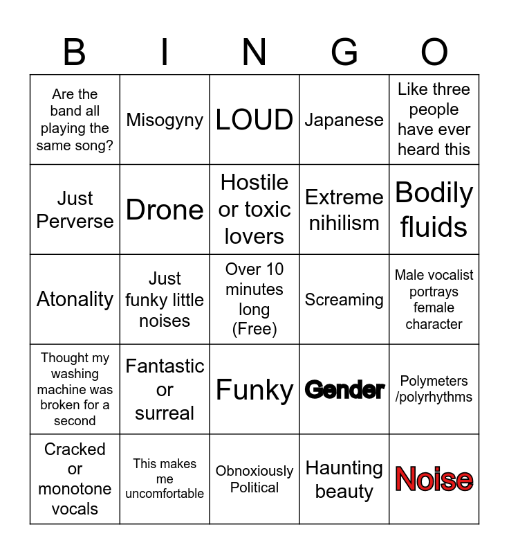 This bingo card has a free space and 24 words: Fantastic or surreal, This makes me uncomfortable, Hostile or toxic lovers, Cracked or monotone vocals, Like three people have ever heard this, Are the band all playing the same song?, Just Perverse, Misogyny, Screaming, Funky, Extreme nihilism, Atonality, Gender, Polymeters /polyrhythms, Drone, Haunting beauty, Male vocalist portrays female character, LOUD, Bodily fluids, Just funky little noises, Noise, Thought my washing machine was broken for a second, Japanese and Obnoxiously Political.