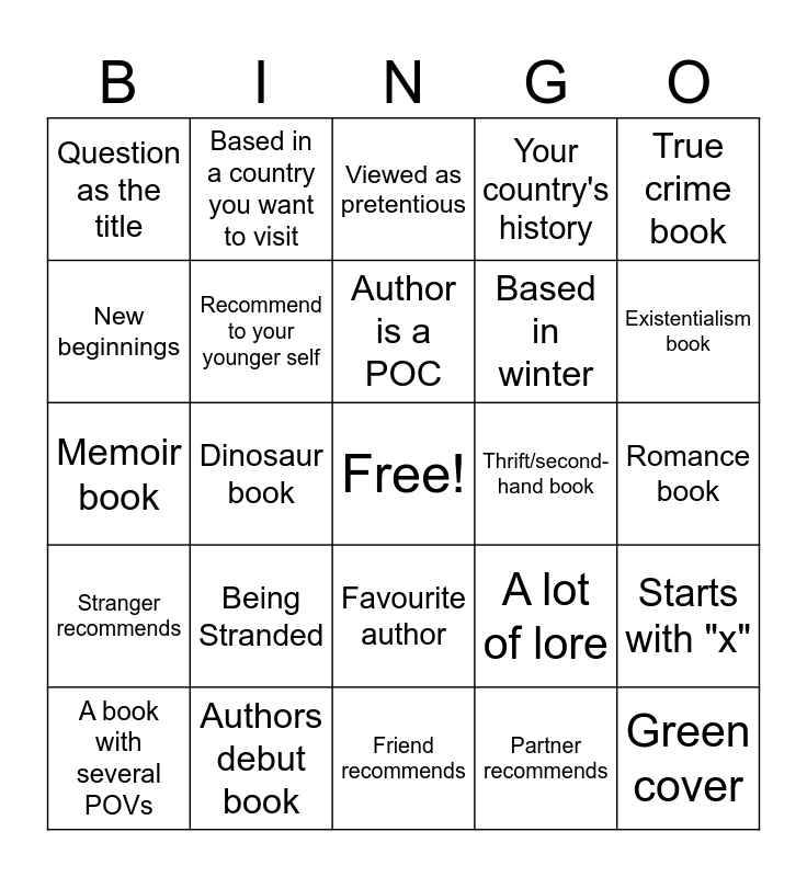This bingo card has a free space and 24 words: Being Stranded, Authors debut book, Author is a POC, A book with several POVs, True crime book, Question as the title, New beginnings, Based in a country you want to visit, Thrift/second-hand book, Favourite author, Based in winter, Memoir book, A lot of lore, Starts with "x", Recommend to your younger self, Partner recommends, Romance book, Viewed as pretentious, Existentialism book, Dinosaur book, Green cover, Stranger recommends, Your country's history and Friend recommends.