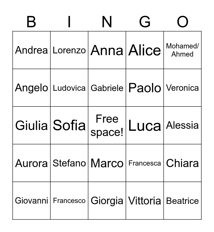 This bingo card has a free space and 24 words: Stefano, Francesco, Gabriele, Giovanni, Mohamed/ Ahmed, Andrea, Angelo, Lorenzo, Luca, Marco, Paolo, Giulia, Francesca, Chiara, Ludovica, Vittoria, Alessia, Anna, Veronica, Sofia, Beatrice, Aurora, Alice and Giorgia.