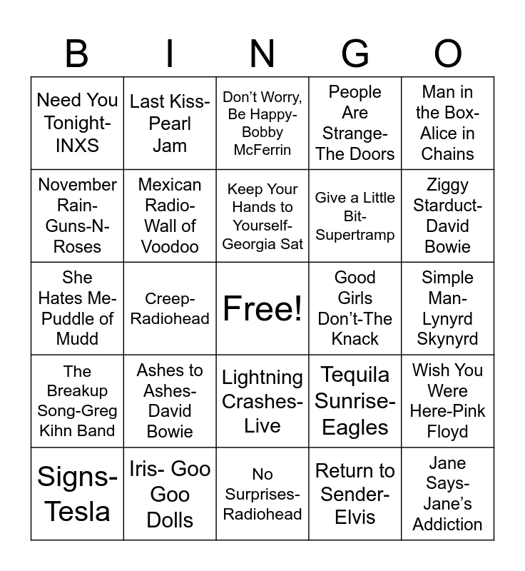This bingo card has a free space and 104 words: What’s Up- 4 Non Blondes, You Shook Me All Night Long- AC/DC, Man in the Box- Alice in Chains, Would?- Alice in Chains, Like A Stone-Audioslave, Fight For Your Right-Beastie Boys, Come Together-Beatles, Eleanor Rigby-Beatles, Captain Jack-Billy Joel, Scenes From An Italian Restaurant-Billy Joel, No Rain-Blind Melon, Grandma Got Run Over By a Reindeer, You’re A Mean One, Mr Grinch, Hard to Handle-Black Crowes, Don’t Fear (The Reaper)-Blue Oyster Cult, Against The Wind-Bob Seger, Don’t Worry, Be Happy-Bobby McFerrin, Living On A Prayer-Bon Jovi, I’m On Fire-Bruce Springsteen, For What It’s Worth-Buffalo Springfield, Video Killed the Radio Star-The Buggles, My Best Friend’s Girl-The Cars, Ain’t That A Shame-Cheap Trick, I Want You to Want Me-Cheap Trick, Wicked Game-Chris Isaak, Ashes to Ashes-David Bowie, Ziggy Starduct-David Bowie, People Are Strange-The Doors, Riders On The Storm-The Doors, New Kid In Town-Eagles, Tequila Sunrise-Eagles, Return to Sender-Elvis, House of the Rising Sun-Animals, Layla-Eric Clapton, Landslide-Fleetwood Mac, Friends in Low Places-Garth Brooks, Monkey-George Michael, One Bourbon, One Scotch, One Bear, Keep Your Hands to Yourself-Georgia Sat, Iris- Goo Goo Dolls, Closer to Home(I’m your Captain)GFR, The Breakup Song-Greg Kihn Band, These Eyes-Guess Who, November Rain-Guns-N-Roses, Let Her Cry-Hootie & the Blowfish, Need You Tonight-INXS, You’re Beautiful-James Blunt, Jane Says-Jane’s Addiction, Aqualung-Jethro Tull, Margaritaville-Jimmy Buffett, Life’s Been Good-Joe Walsh, Hurts So Good-John Mellencamp, A Boy Named Sue-Johnny Cash, Don’t Stop Believing-Journey, Dust In The Wind-Kansas, All Day and All of the Night-Kinks, Lola-Kinks, All My Love-Led Zeppelin, Believe-Lenny Kravitz, Lightning Crashes-Live, Simple Man-Lynyrd Skynyrd, 3AM-Matchbox 20, Symphony of Destruction-Megadeth, Enter Sandman-Metallica, Rocking in the Free World-Neil Young, Champagne Supernova-Oasis, Daugher-Pearl Jam, Last Kiss-Pearl Jam, She Hates Me-Puddle of Mudd, Creep-Radiohead, No Surprises-Radiohead, Losing My Religion-REM, The Sound of Silence-Simon & Garfunkel, Don’t You (Forget About Me)Simple Minds, Chasing Cars-Snow Patrol, Born to be Wild-Steppenwolf, Fox on the Run-Sweet, Signs-Tesla, You’re So Bad-Tom Petty, I Hate Everything About You-Ugle Kid Joe, Ice Cream Man-Van Halen, One Headlight-Wallflowers, Mexican Radio-Wall of Voodoo, Squeeze Box-The Who, Good Girls Don’t-The Knack, All Apologies-Nirvana, Fat Bottomed Girls-Queen, Beautiful-Brian Kibler, Love Her Madly-The Doors, Rocket Man-Elton John, Cats in the Cradle-Harry Chapin, Mama I’m Coming Home-Ozzy, Baby I love your way-Peter Frampton, Wish You Were Here-Pink Floyd, Love of my Life-Queen, Under Pressure-Queen, Mother’s Little Helper-Rolling Stones, Give a Little Bit-Supertramp, Into the Great Wide Open-Tom Petty, Waiting on a Friend-Rolling Stones, Gimme Some Lovin-Spencer Davis Group, Lawyers,Guns & Money-Warren Zevon, Black Hole Sun-Sondgarden and Space Oddity-David Bowie.