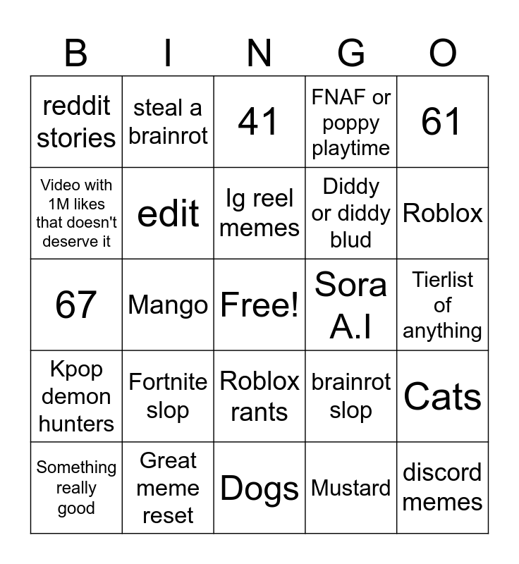 This bingo card has a free space and 24 words: Fortnite slop, Great meme reset, Ig reel memes, Something really good, 61, reddit stories, Video with 1M likes that doesn't deserve it, steal a brainrot, Sora A.I, Roblox rants, Diddy or diddy blud, 67, brainrot slop, Cats, edit, Mustard, Tierlist of anything, 41, Roblox, Mango, discord memes, Kpop demon hunters, FNAF or poppy playtime and Dogs.