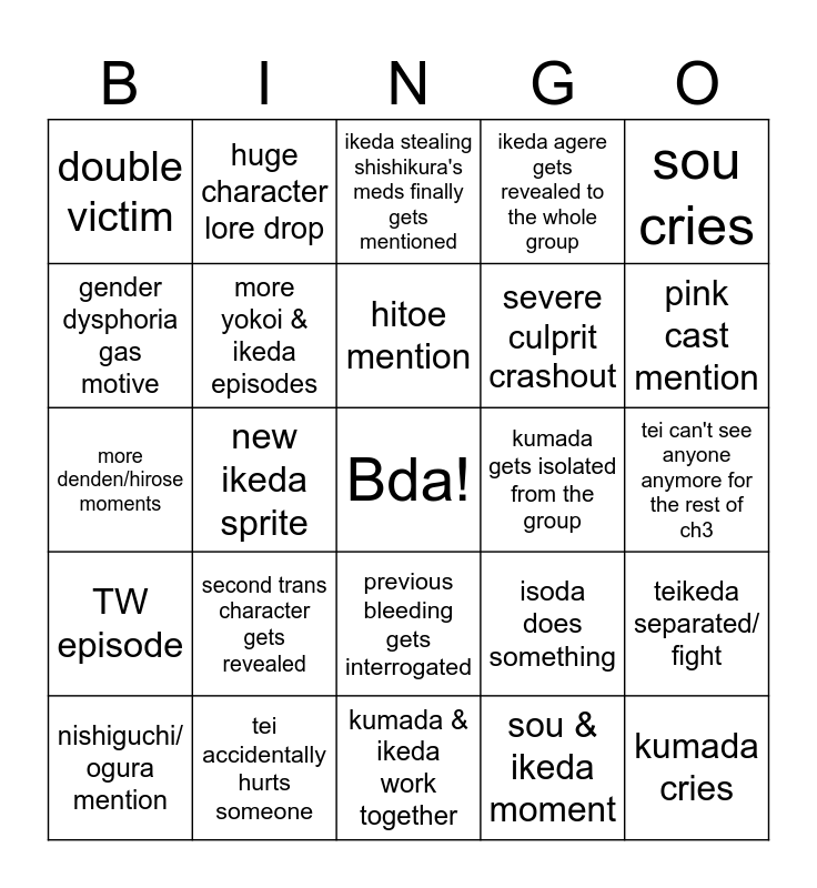 This bingo card has a free space and 24 words: second trans character gets revealed, tei accidentally hurts someone, hitoe mention, nishiguchi/ ogura mention, sou cries, double victim, gender dysphoria gas motive, huge character lore drop, kumada gets isolated from the group, previous bleeding gets interrogated, severe culprit crashout, more denden/hirose moments, isoda does something, teikeda separated/ fight, more yokoi & ikeda episodes, sou & ikeda moment, tei can't see anyone anymore for the rest of ch3, ikeda stealing shishikura's meds finally gets mentioned, pink cast mention, new ikeda sprite, kumada cries, TW episode, ikeda agere gets revealed to the whole group and kumada & ikeda work together.